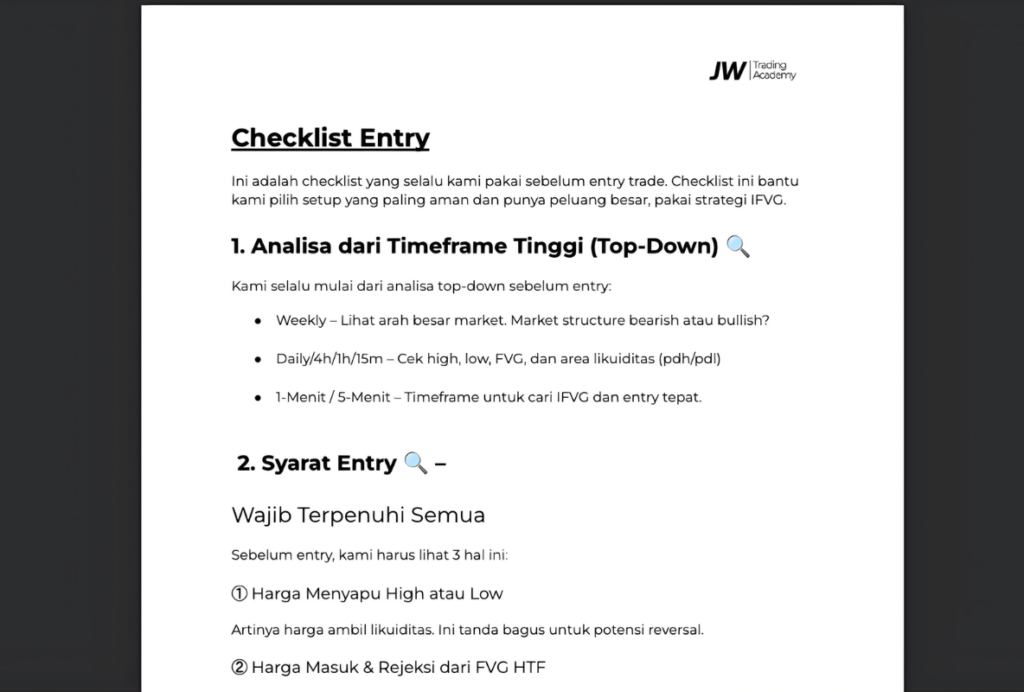 Akses permanen ke video course dan seluruh materi edukasi, termasuk PDF, quiz, dan trading journal.