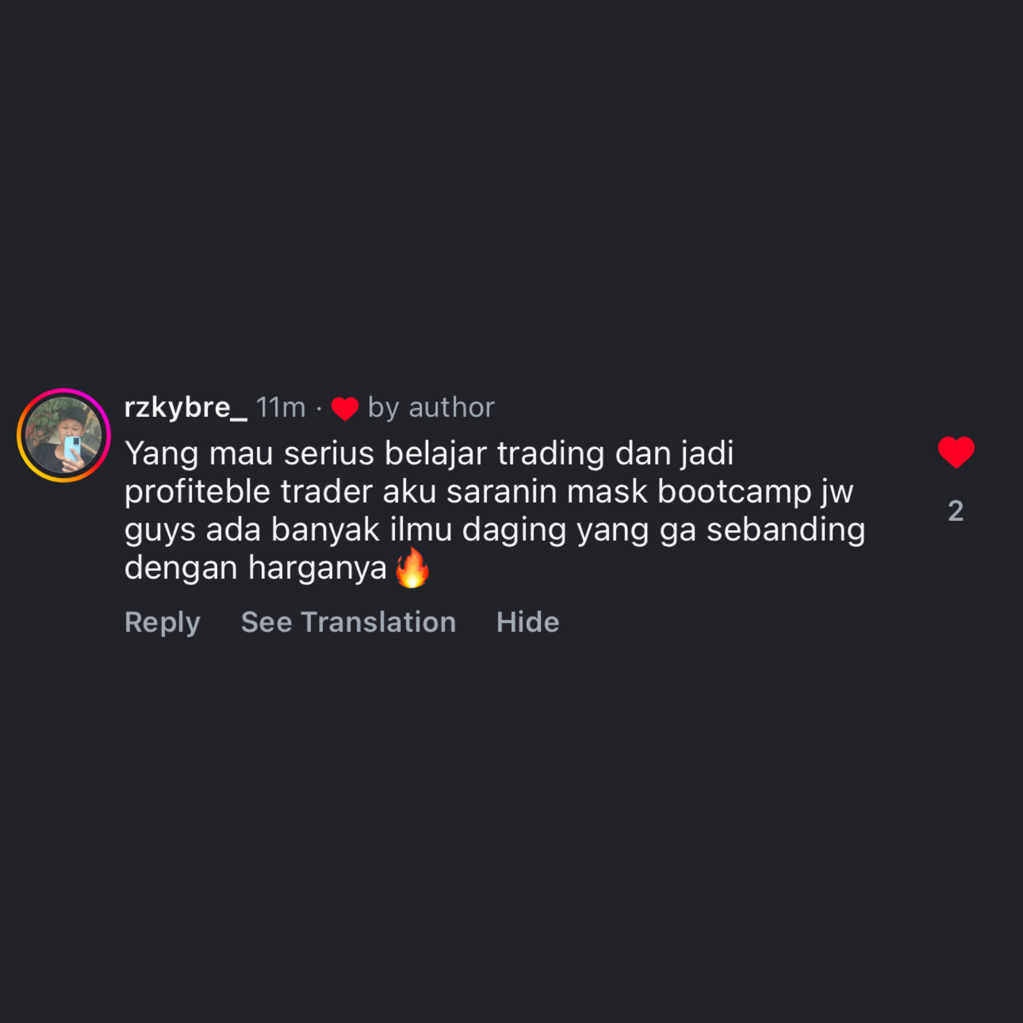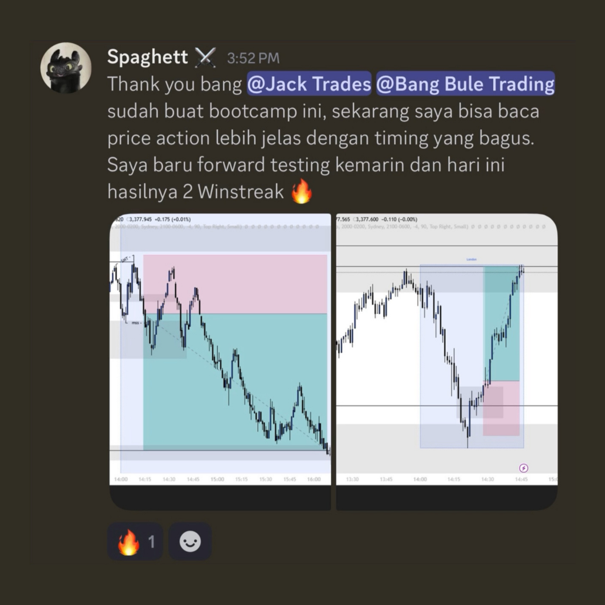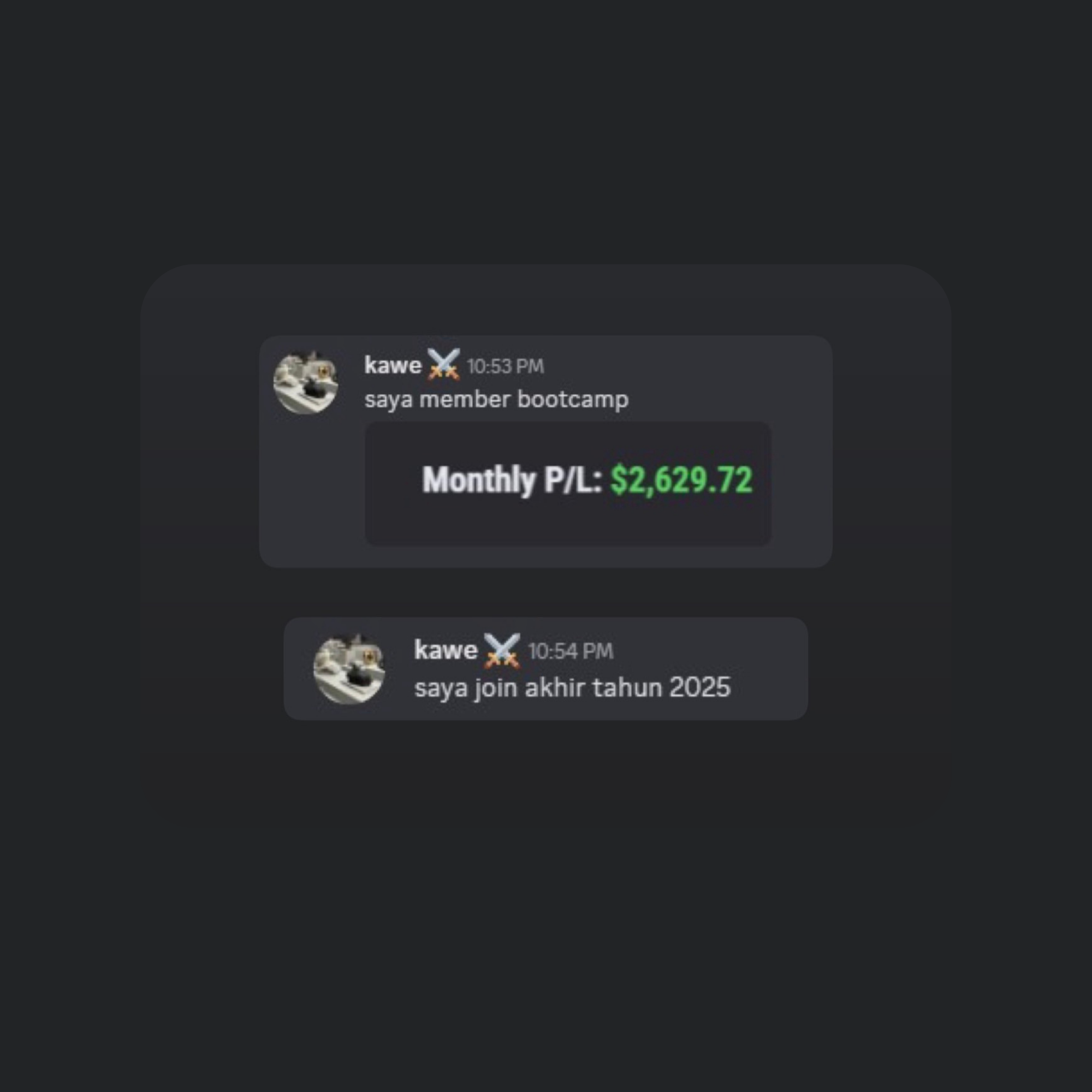 Bootcamp ini tidak hanya fokus pada entry, tetapi membangun struktur lengkap dari analisa hingga konsistensi.
